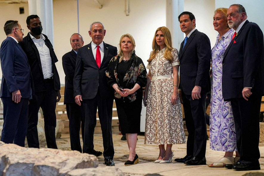وزير الخارجية الأميركي ماركو روبيو وزوجته في لقطة مع رئيس الوزراء الإسرائيلي بنيامين نتنياهو وزوجته والسفير الأميركي مايك هاكابي وقرينته في أنفاق حائط البراق بالبلدة القديمة في القدس يوم الأحد (أ.ف.ب)