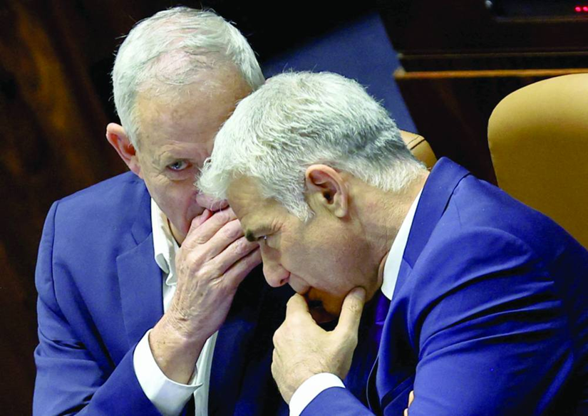 حوار هامس بين غانتس ولبيد بجلسة للكنيست الإسرائيلي في يونيو 2022 (رويترز)