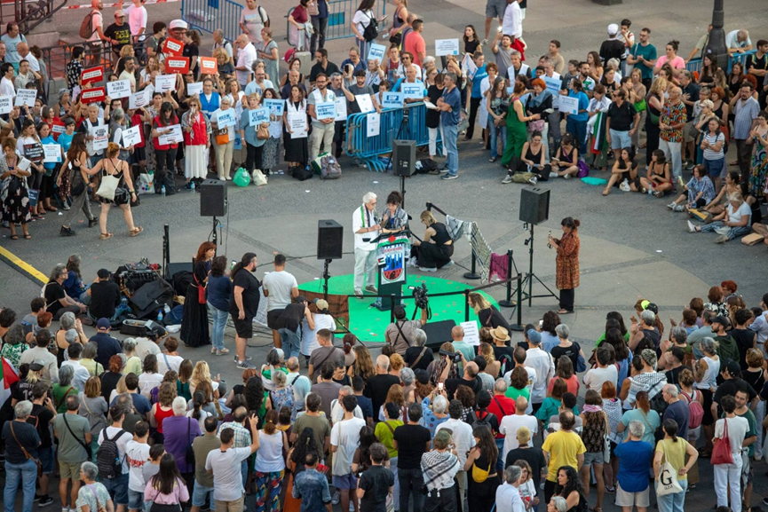 فعالية بساحة بويرتا ديل سول في مدريد يوم 15 سبتمبر الحالي لقراءة أسماء الأطفال الفلسطينيين الذين قتلتهم إسرائيل (د.ب.أ)