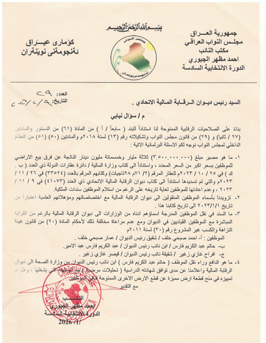 وأشار الجبوري في كتابه إلى “وجود مخاطبات رسمية سابقة بين وزارة المالية وديوان الرقابة المالية بشأن الموضوع”، متسائلاً عن “أسباب عدم إعادة المبلغ إلى الموظفين حتى الآن، رغم تسلمهم سندات الملكية الخاصة بتلك الأراضي“.