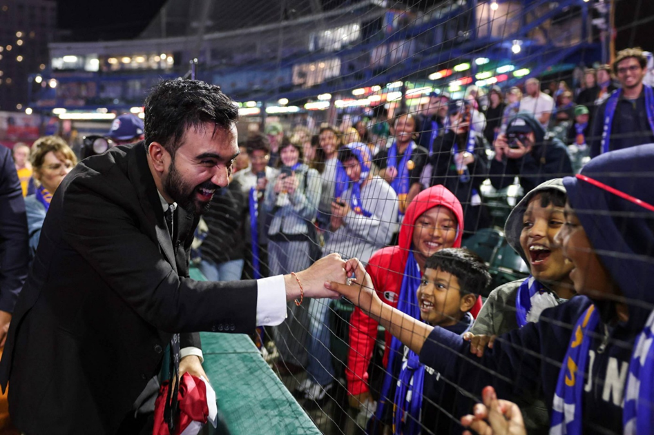 المرشح الديمقراطي لرئاسة بلدية نيويورك زهران ممداني يصافح الحضور خلال مباراة لكرة القدم في نيويورك يوم 19 أكتوبر (أ.ف.ب)