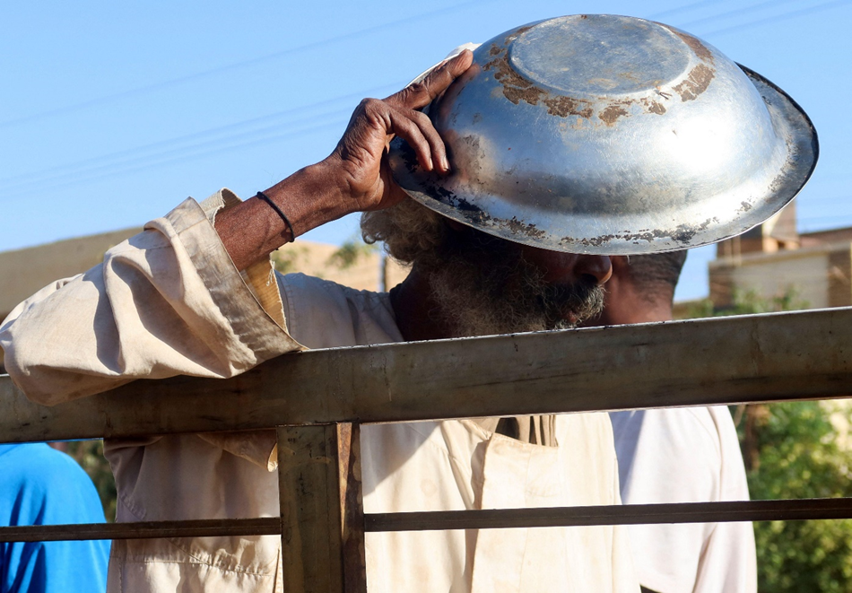 رجل سوداني يحتمي من الشمس بقدر طعام بينما ينتظر في طابور للحصول على حصة غذائية في أم درمان