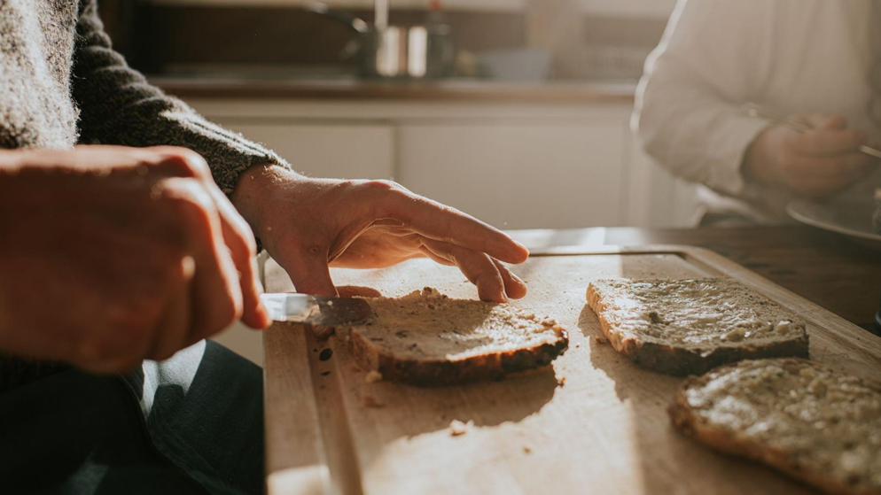 لقطة مقرّبة لرجل يدهن الزبدة على خبز أسمر محمص قليلاً في مشهد إفطار صباحي. مشهد بسيط لتحضير وجبة في صباح مشمس.