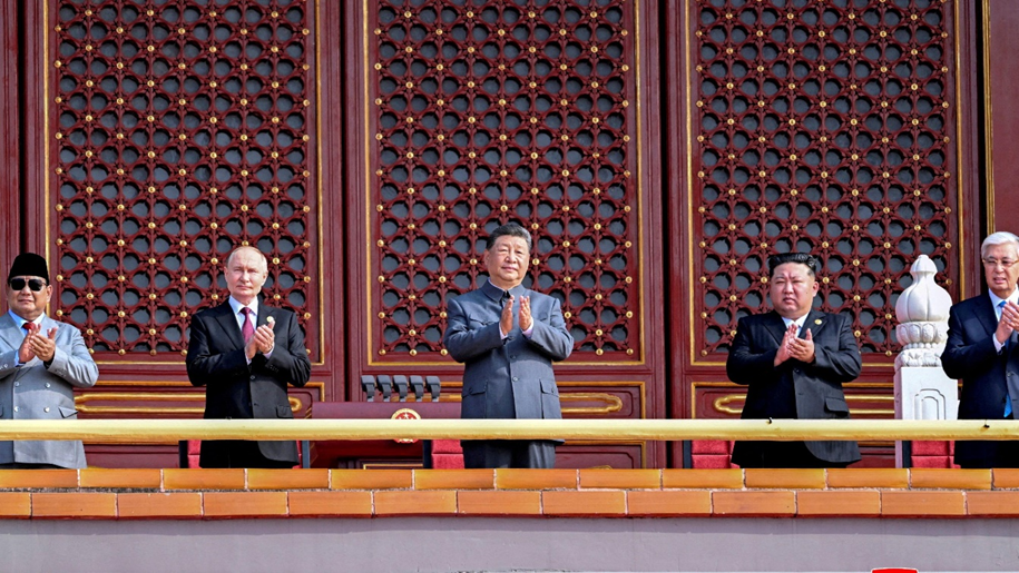 الزعيم الكوري الشمالي كيم جونغ أون والرئيس الروسي فلاديمير بوتن والرئيس الصيني شي جين بينغ خلال حضورهم عرضاً عسكرياً في بكين