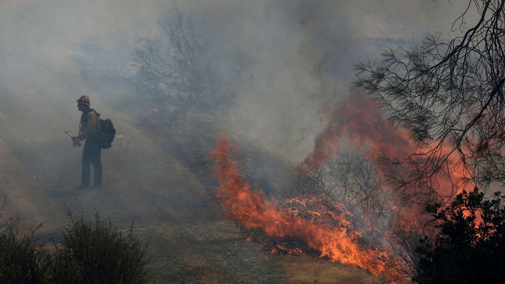 يسير أحد رجال الإطفاء التابعين لإدارة كال فاير بجوار ألسنة اللهب المتصاعدة من حريق 6-5 ضمن مجمع حرائق البرق في 3 سبتمبر/أيلول 2025 بالقرب من تشاينيز كامب، كاليفورنيا.