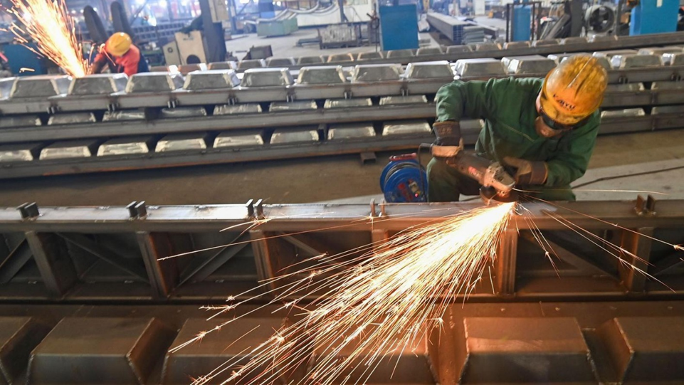 عامل يقوم بعمليات تلميع في ورشة عمل تابعة لشركة تصنيع معدات ميكانيكية في مدينة ويفانغ بمقاطعة شاندونغ الصينية، بتاريخ 27 ديسمبر/كانون الأول 2025.