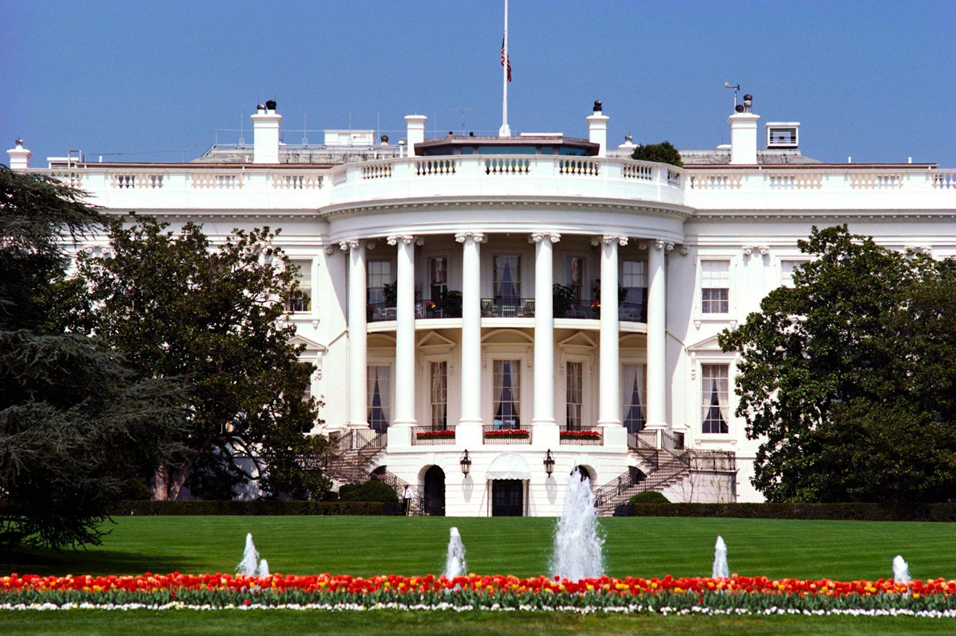 صورة أرشيفية لواجهة مبنى البيت الأبيض، في واشنطن العاصمة حيث السماء صافية وعشب أخضر يمتد أمامه ونوافير صغيرة وورود حمراء وبرتقالية، ويحيط بها عدد من الأشجار الخضراء.