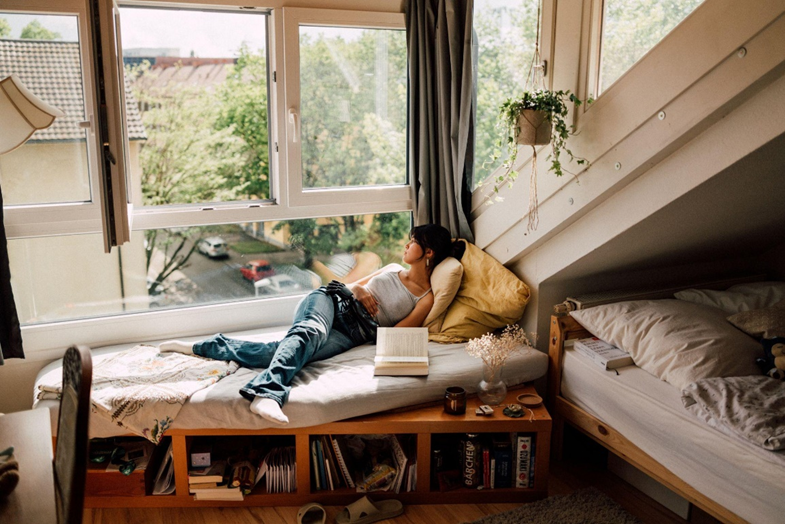 شابة تسترخي على مقعد النافذة، محاطة بغرفة نوم مريحة وهادئة مع إضاءة طبيعية ونباتات.