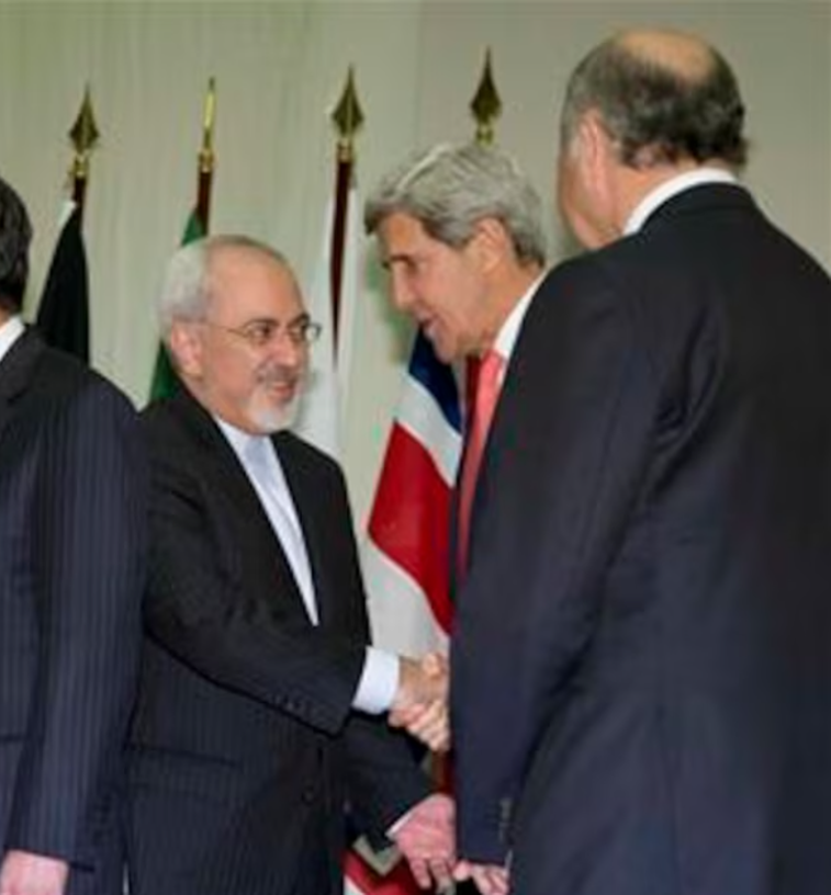 وزير الخارجية الإيراني محمد جواد ظريف، ووزير الخارجية الأمريكي جون كيري، ووزير الخارجية الفرنسي لوران فابيوس يتبادلون التحية والمصافحة في قصر الأمم بجنيف في 24 نوفمبر/تشرين الثاني 2013.
