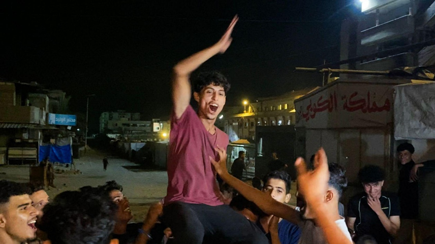 فلسطينيون يحتفلون في خان يونس في 9 أكتوبر/تشرين الأول 2025 بعد الإعلان عن اتفاق جديد لوقف إطلاق النار في غزة