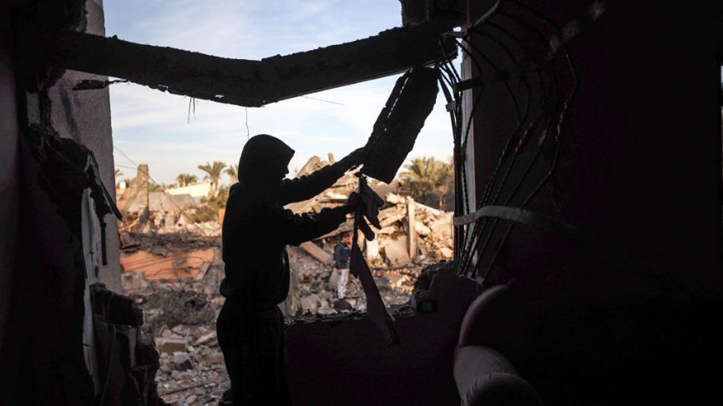 رجل يتفقد منزله إثر غارة إسرائيلية في دير البلح بقطاع غزة، يوم 15 يناير/كانون الثاني 2025