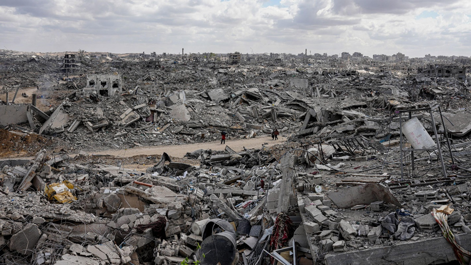 فلسطينيون يسيرون بين أنقاض مبانٍ مدمرة في حي في مدينة غزة، بعد سريان وقف إطلاق النار وانسحاب القوات الإسرائيلية من أجزاء من قطاع غزة.