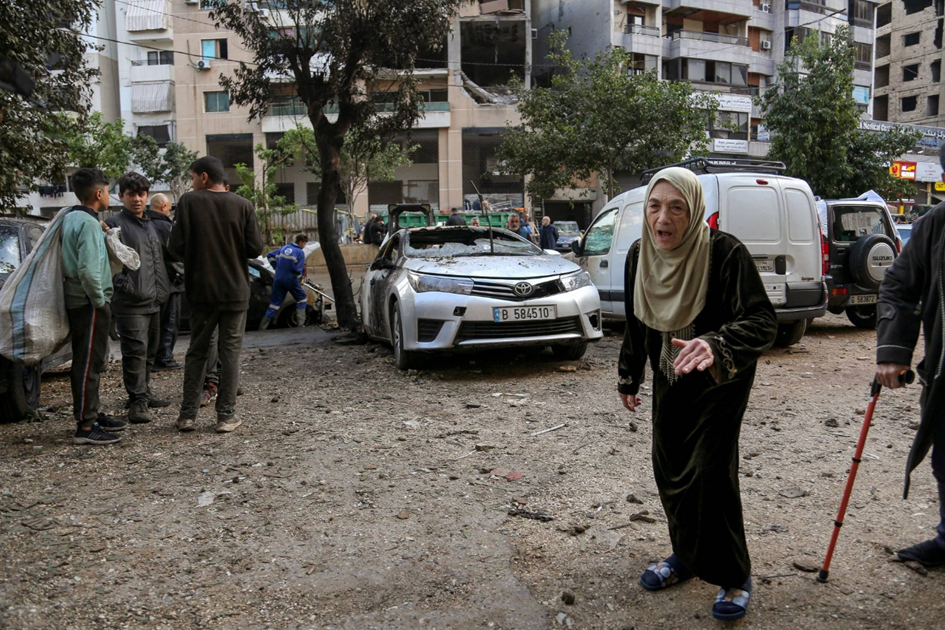 لبنانية تمشي أمام مكتب «حماس» المدمر بعد هجوم إسرائيلي أسفر عن مقتل صالح العاروري في الضاحية الجنوبية لبيروت في 2 يناير 2024 (د.ب.أ)