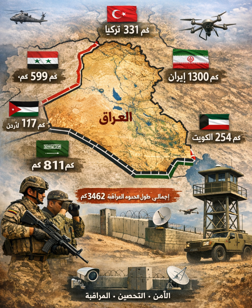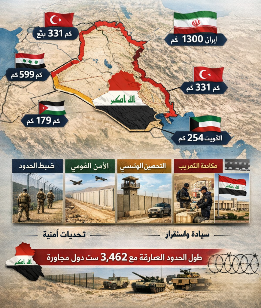 يبلغ إجمالي طول الحدود البرية للعراق نحو 3,462 كم مع ست دول مجاورة، مما يشكّل تحديًا مستمرًا للأمن القومي والسيادة الوطنية.