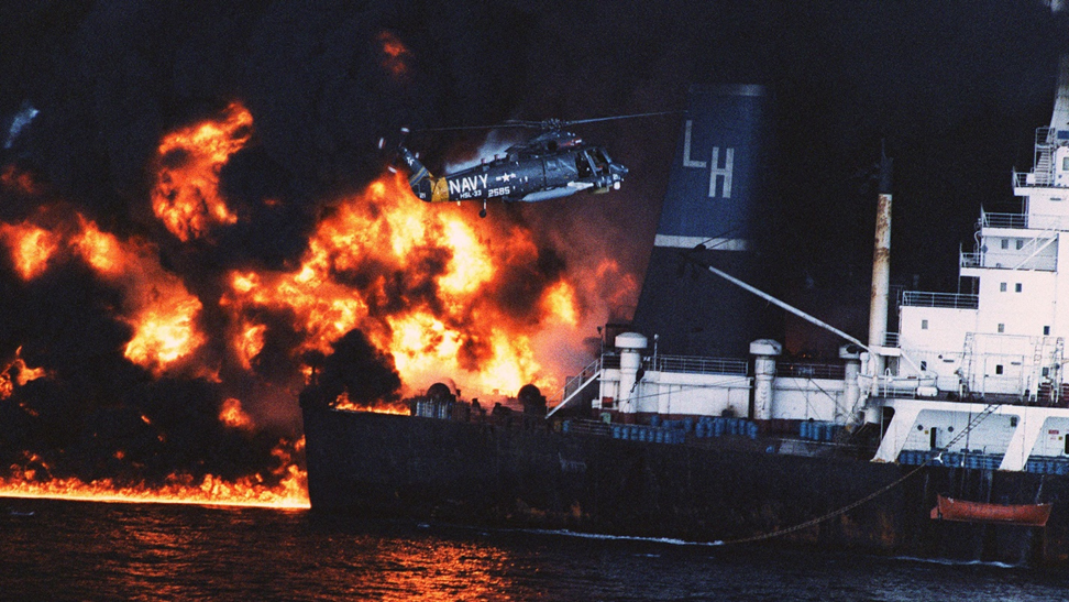 مروحية تابعة للبحرية الأمريكية من حاملة الطائرات يو إس إس تشاندلر تتجه لإنقاذ أفراد الطاقم على متن ناقلة النفط القبرصية بيفوت التي يبلغ وزنها 210 آلاف طن خلال الحرب الإيرانية العراقية التي دارت بين عامي 1980 و1988.