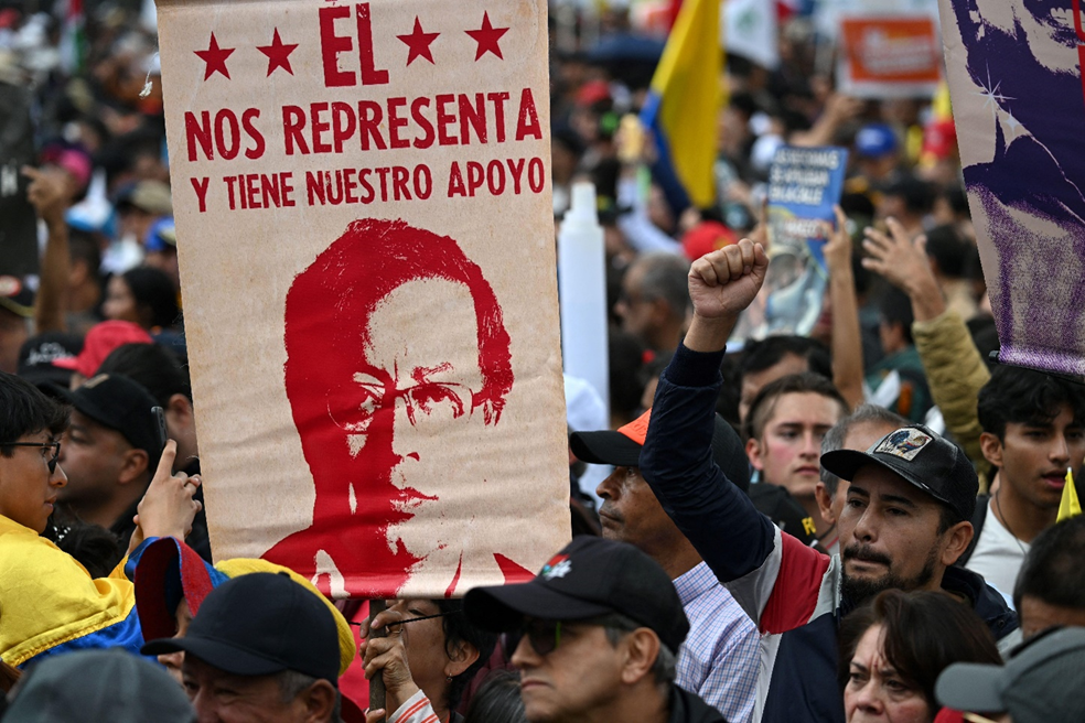مؤيدون للرئيس الكولومبي غوستافو بيترو يرفع لافتة كتب عليها “هو يمثلنا ويحظى بدعمنا”، خلال تجمع في بوغوتا للضغط على الكونغرس لإقرار إصلاحات الحكومة (18 مارس 2025).