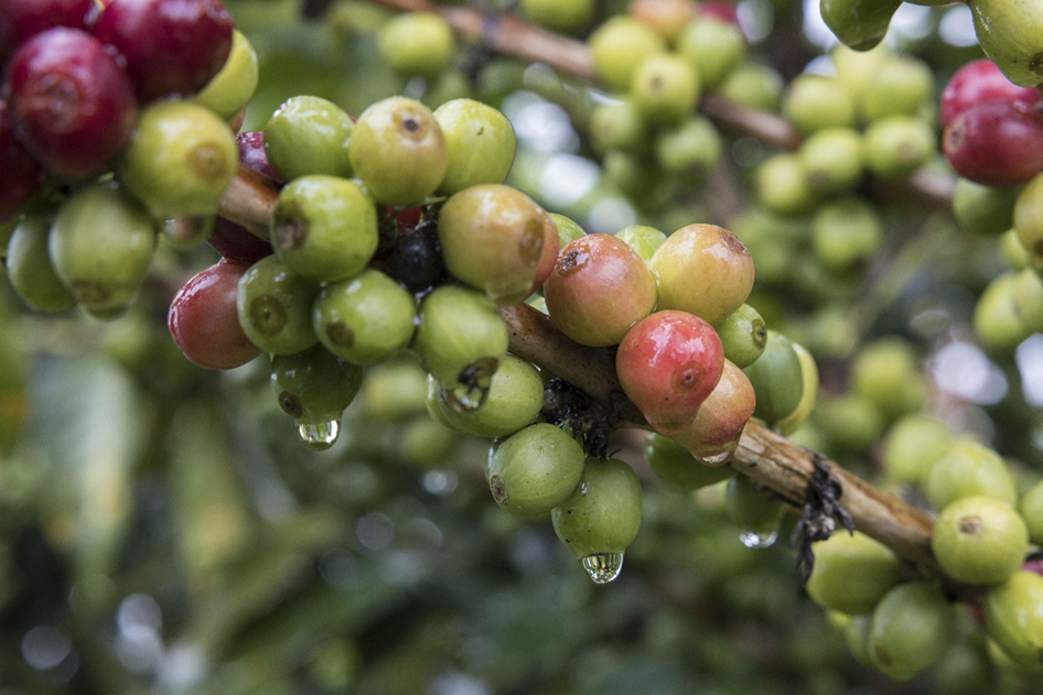 ثمار البن تنمو في مزرعة بسان أوغستين، إقليم هوِيلا في كولومبيا.