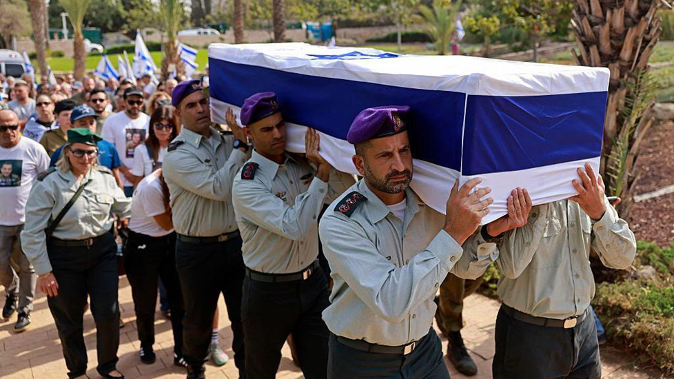جنود إسرائيليون يحملون نعش العقيد عساف حمامي، الضابط الأعلى رتبة الذي قتلته حماس، خلال جنازته في مقبرة كريات شاؤول العسكرية في تل أبيب.