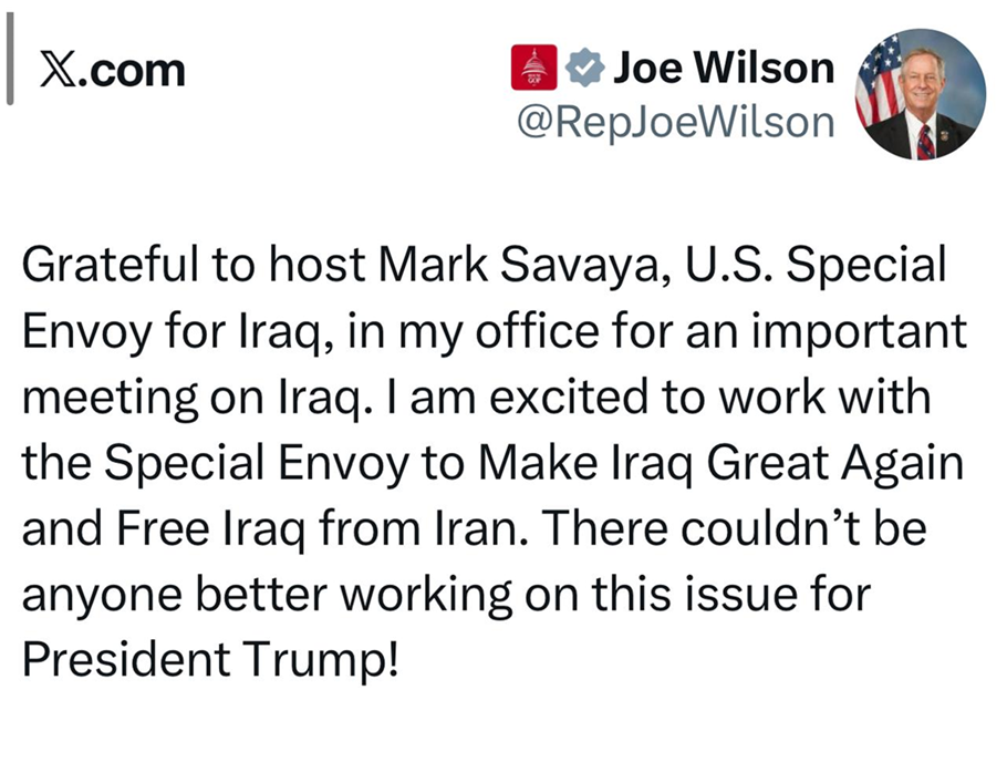 وأضاف ويلسون، “أنا متحمس للعمل مع المبعوث الخاص لجعل العراق عظيماً مرة أخرى وتحرير العراق من إيران. لا يمكن أن يكون هناك أي شخص أفضل للتعامل مع هذا الملف نيابة عن الرئيس ترامب”.