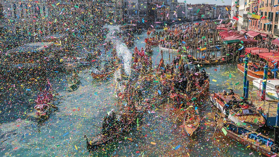 تظهر الصورة جرذاً ضخماً مصنوعاً من الورق المعجون، ينفجر بالقصاصات الملونة وهو يبحر عبر القناة الكبرى خلال موكب الماء الذي يفتتح به مهرجان البندقية في فبراير/ شباط الماضي، في مشهد نابض بالألوان المتوهجة. هذا الجرذ، الذي تحوّل إلى بطل عرض بصري، إذ يتخيل الجميع أنه خرج من مجارير المدينة، مجسداً جانبها الكوميدي الخفي. وبينما تنشر هذه الانفجارات الورق الملون في كل مكان، يعكس مشهد هذا الجرذ تبايناً صارخاً مع الغلالة المضيئة الأنيقة التي تغلف البندقية في عدد لا يحصى من اللوحات، مثل لوحة “مدخل القناة الكبرى” التي رسمها بول سينياك عام 1905 من مدرسة الانطباعية الجديدة. في كلا المشهدين، تذوب البندقية في فسيفساء من الضوء المتناثر.