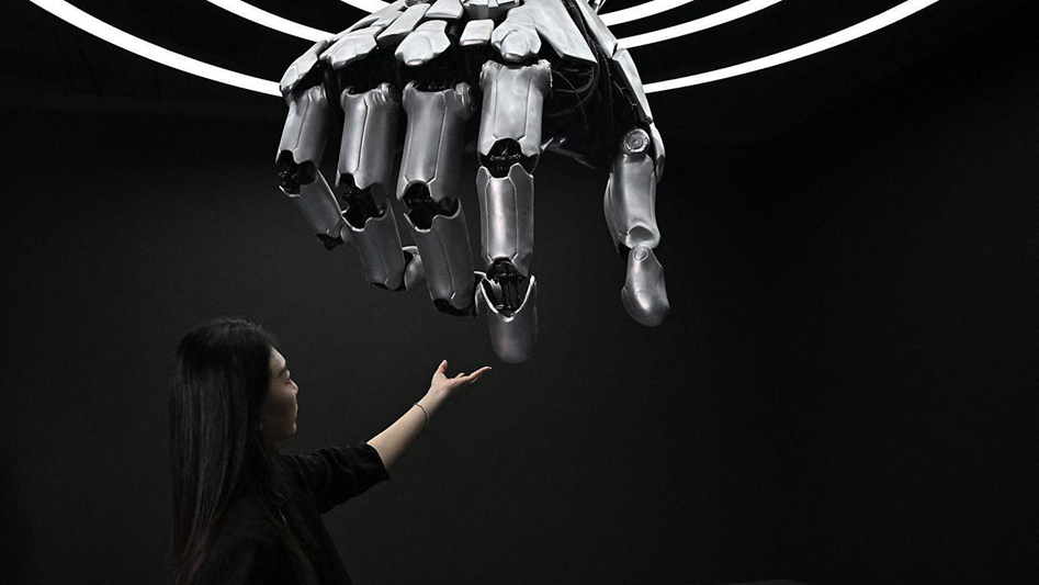 تُظهر الصورة، التي التقطت خلال جولة صحفية في “عالم الروبوتات” في بكين في إبريل/نيسان، شابة تمد يدها لتلامس أصبعاً آلياً ضخماً ينفرج ببطء. الإضاءة الدرامية وملابس الفتاة السوداء تتداخلان لتقليص حضورها البشري إلى ومضات من الجلد: ساعدان طافيان وشذرة من ملامح الوجه معلّقة في الظلام. للوهلة الأولى، قد يستحضر هذا التلامس القريب لوحة “خلق آدم” لمايكل أنجلو، أو ربما بشكل أدق، رسمة “إم. سي. إيشر” المحيّرة “أيدي ترسم أيدي” (1948). وفي عصر الذكاء الاصطناعي، بات من الصعوبة بمكان تمييز الخط الفاصل بين المبدع والعمل الإبداعي.