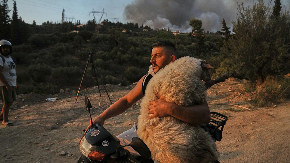 وسط دخان كثيف يشبه الصوف، يتصاعد من حرائق الغابات التي ضربت مدينة باتراس اليونانية في أغسطس/آب الماضي، يظهر رجل على دراجة نارية وهو ينقذ خروفاً يتشبث به بكل ما أوتي من قوة. هذه اللفتة تستحضر صور الراعي الصالح في سراديب الموتى الرومانية من القرنين الثاني والثالث، حيث يحمل المسيح حيواناً ضعيفاً على كتفيه. عبر العصور، يظل هذا الرمز المتكرر – سواء في اللوحات الجدارية أو الصور الفوتوغرافية – تأكيداً على الطابع الأسطوري الدائم للبطولة.