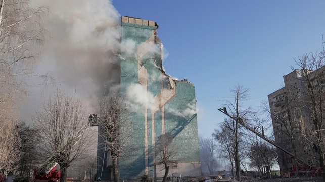 وأظهر مقطع فيديو نشره زيلينسكي انهيار أحد البرجين السكنيين بالكامل. وقال وزير الداخلية إيغور كليمنكو إن المبنى دُمر بالكامل بين الطابقين الثالث والتاسع.