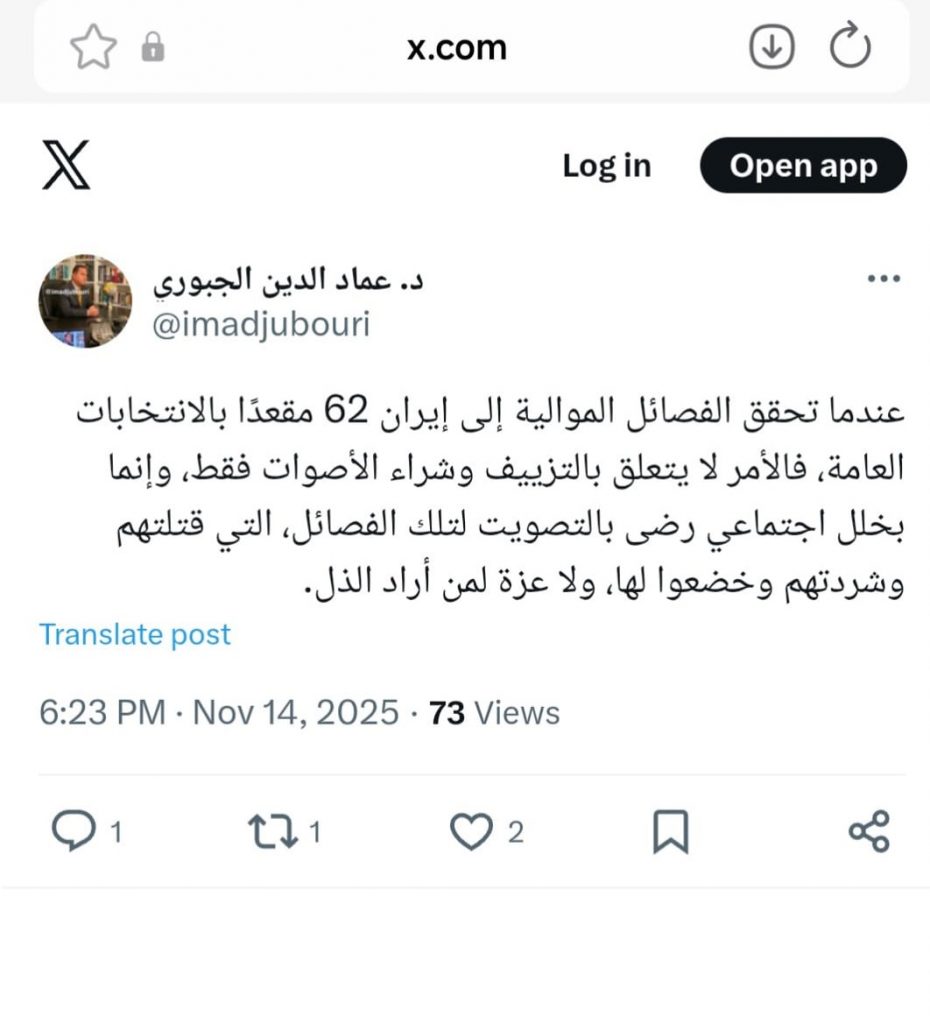 في تغريدة على منصة اكس اعبر فيها الدكتور عماد الدين الجبوري بان نتائج الانتخابات ليست مجرد أرقام أو مقاعد، بل مرآة لواقعٍ اجتماعي يكشف حجم الخلل في الوعي الجمعي، حين تتحوّل الآلام التي سبّبتها الفصائل إلى أصوات تمنحها شرعية جديدة، في مشهد يعكس أزمةً أعمق من صندوق اقتراع، وادناه نص التغريدة: