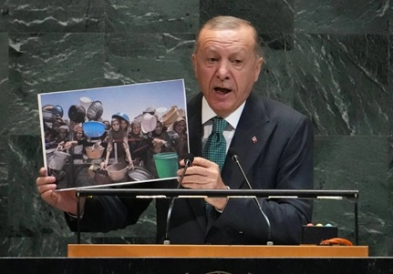 الرئيس التركي رجب طيب إردوغان يعرض صورة لسكان من غزة أثناء حديثه في الجمعية العامة للأمم المتحدة في مقر المنظمة بنيويورك 23 سبتمبر 2025 (أ.ف.ب)