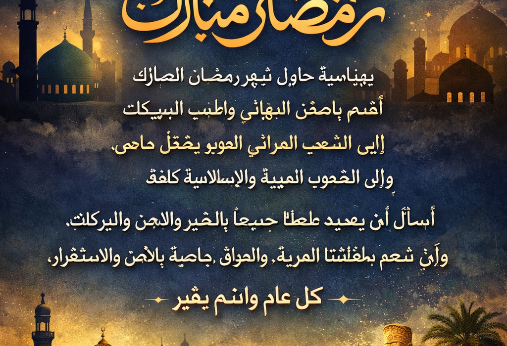 منذ 4 أسابيع رمضان مبارك على العراق والأمة العربية بمناسبة حلول شهر رمضان المبارك، أتقدم بأصدق التهاني وأطيب التبريكات إلى الشعب العراقي العزيز بشكل خاص، وإلى الشعوب العربية والإسلامية